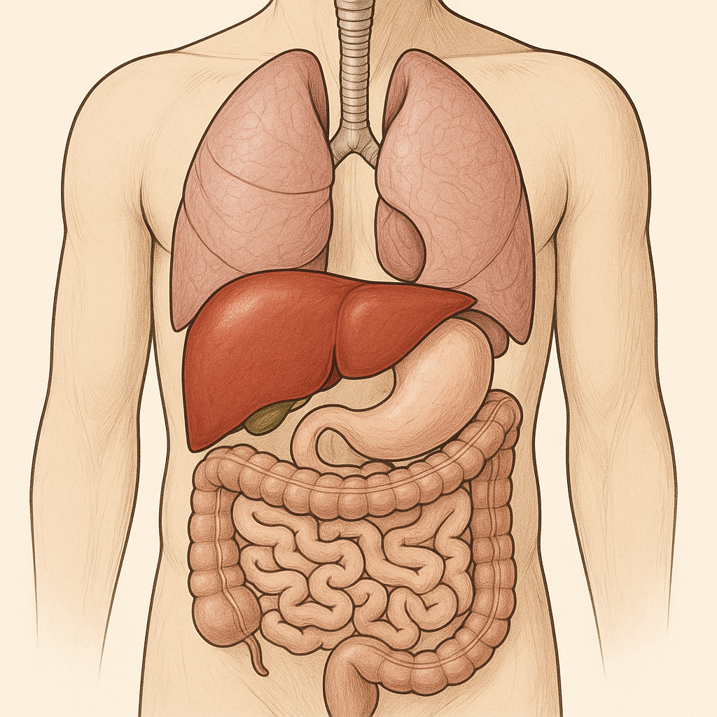 간(Liver)은 인체 장기 중 가장 크며, 주로 오른쪽 윗배(우상복부)에 위치해 있습니다. 갈비뼈(늑골) 안에 대부분 숨겨져 있어 외부 충격으로부터 보호받습니다.