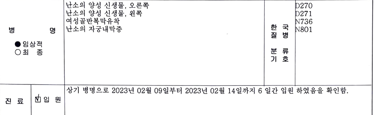 제 병명은 난소의 자궁내막증, 난소의 양성 신생물 이네요.