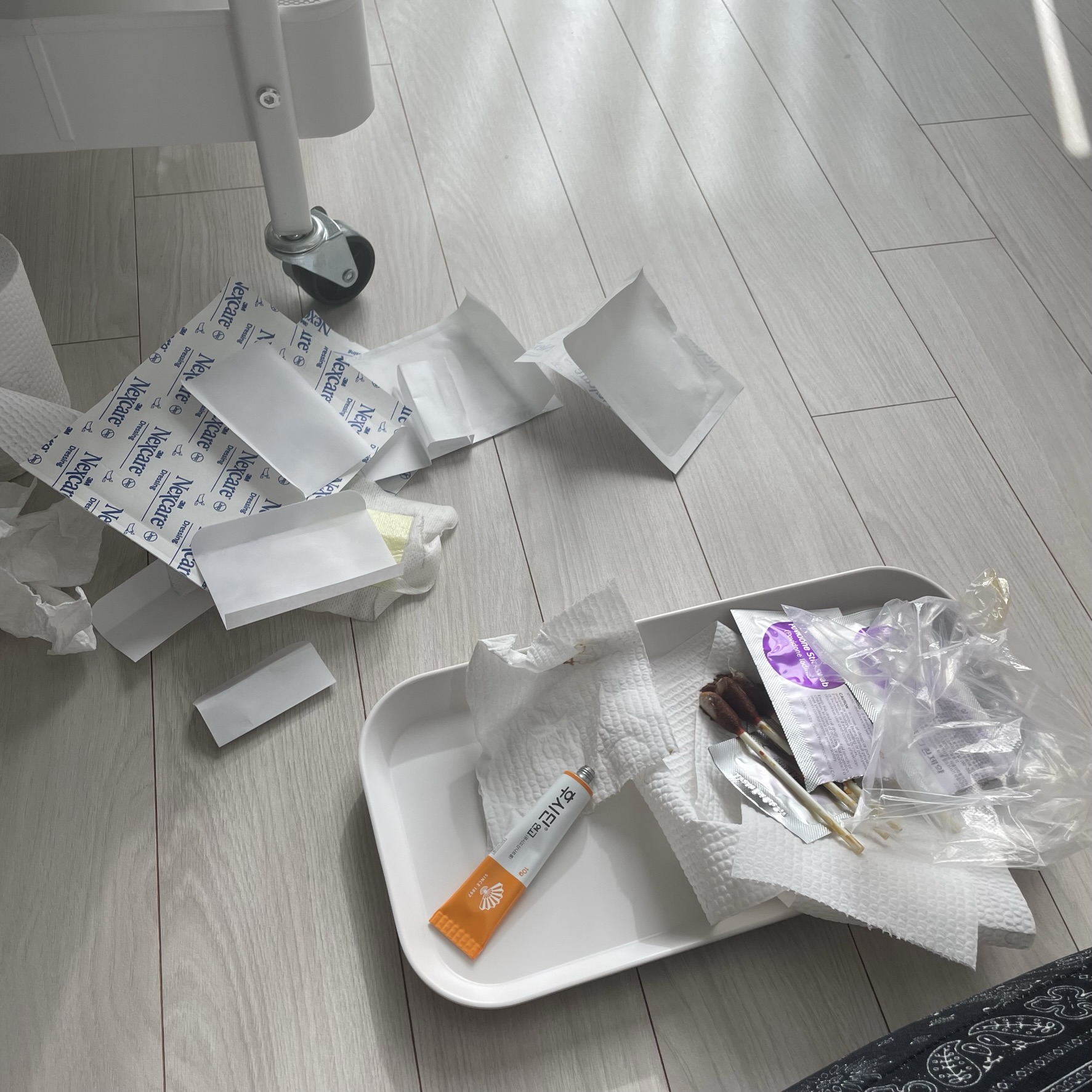 거울보면서 셀프 소독 후 후시딘을 얇게 바르고 그 위에 넥스케어 밴드를 붙여줍니다.