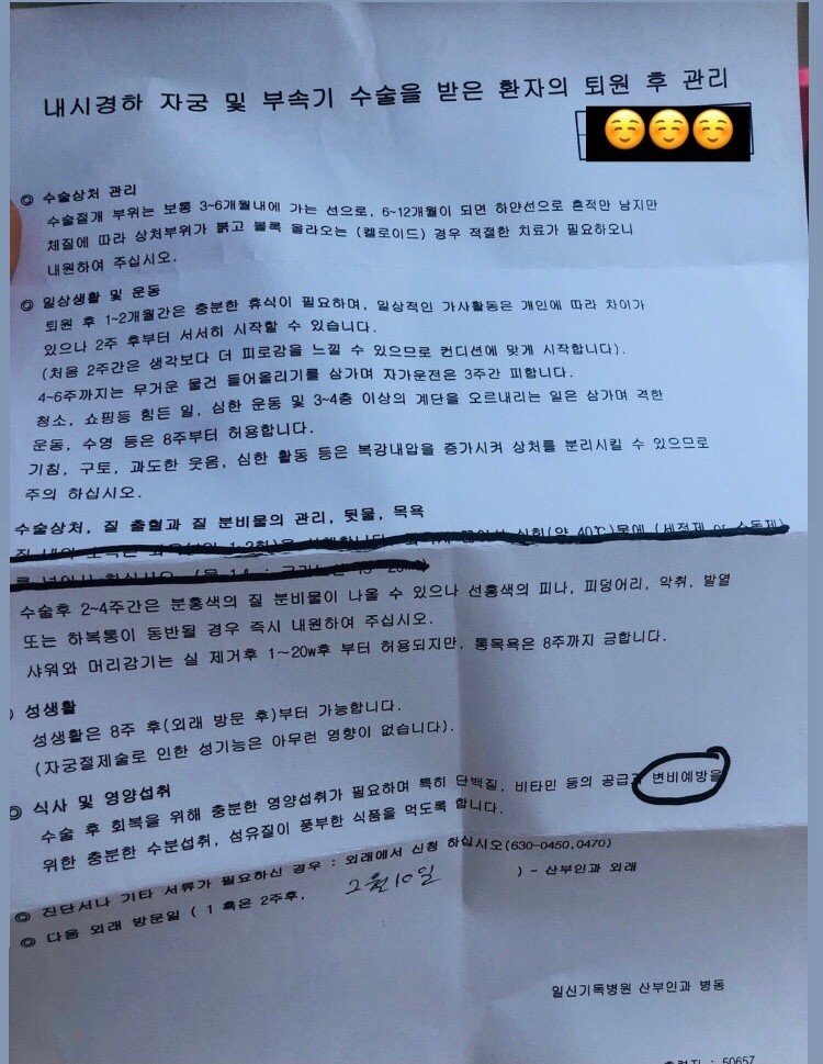 난소낭종 복강경 수술 후 퇴원을 한 저는 관리 종이를 받아왔습니다.