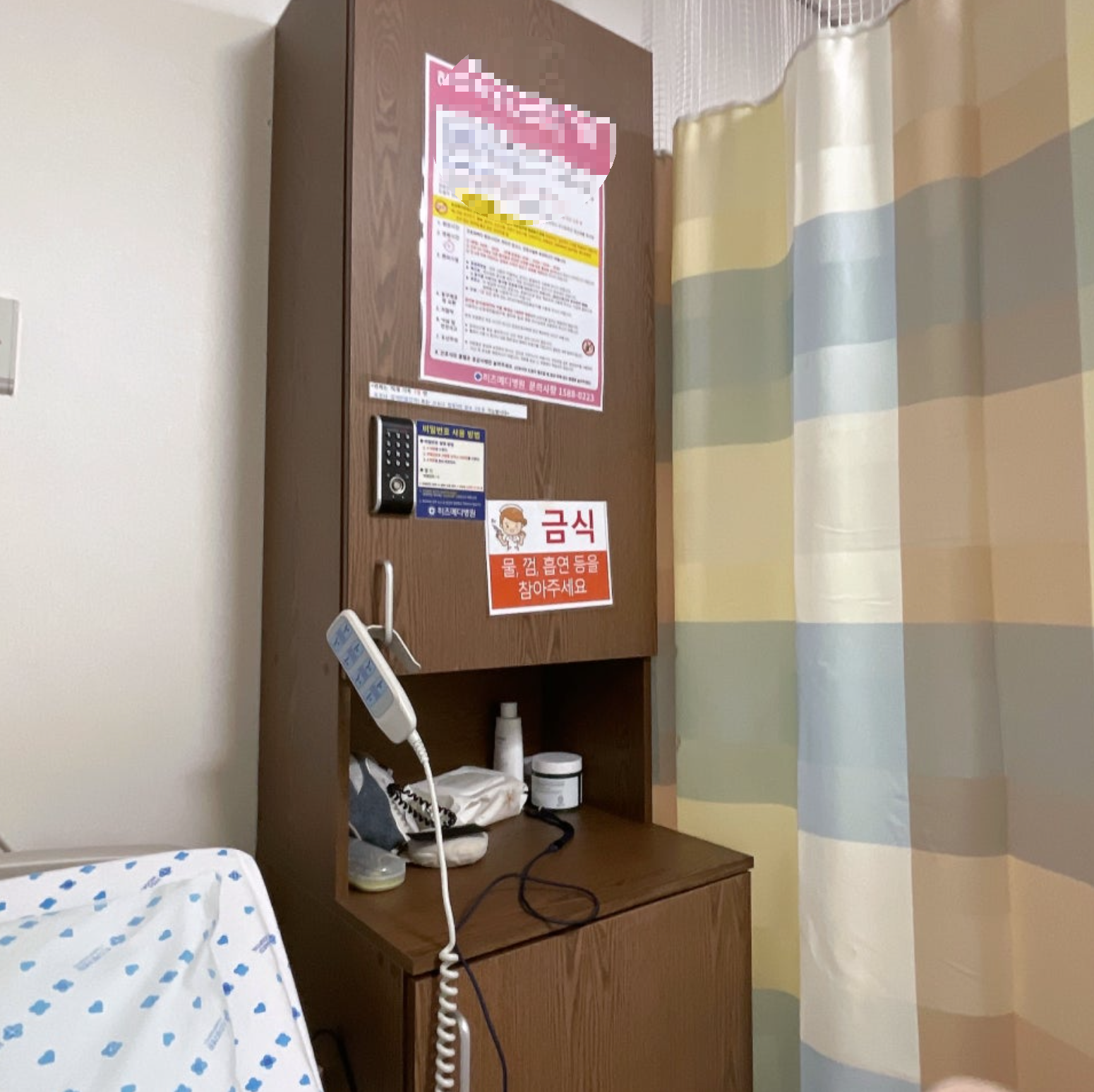 입원 후 가장 먼저 한 일은 멀티탭과 휴대폰 거치대 설치였습니다. 수술 후에는 몸을 일으키기 어렵고 팔을 들기도 힘들기 때문에 휴대폰 거치대가 필수였고, 핸드폰 전원이 꺼지지 않도록 충전기까지 연결해둬야 합니다. 수술 끝나고 오면 마취도 덜 풀린 채로 폰 만지기 쉽지 않고, 그리고 엄마아빠한테 전화해줘야 하는데 손에 힘이 안 들어가서 거치대가 없으면 전화도 걸기 힘들어요. 왜냐면 거치대에 있기라도 하면 시리한테 전화하라고 시키면 되기 때문이에요. 물론 에어팟 끼고요. 처음에 2박 3일이면 퇴원할 수 있을 거라고 하셨는데, 결론적으로 5박 6일 동안 입원했던 사람으로서, 폰 거치대 없었으면 못 버텼을 것이라고 단언합니다.