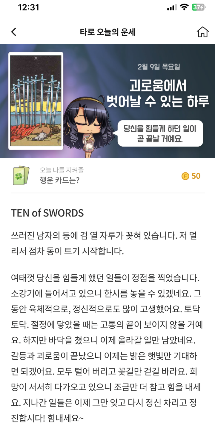 밤 12시가 넘은 수술 당일, 자기 전에 오늘의 운세 타로점을 봤는데 이렇게 결과가 나왔습니다.