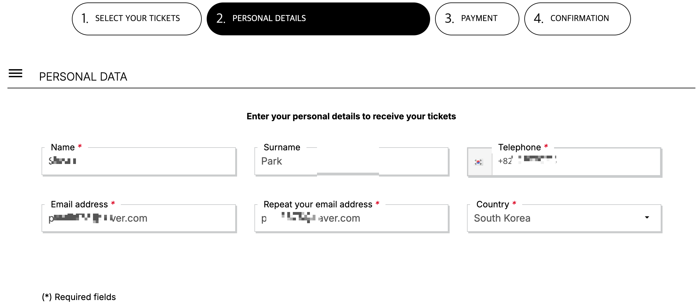 이름, 성, 휴대폰번호, 이메일, 나라 를 입력합니다.