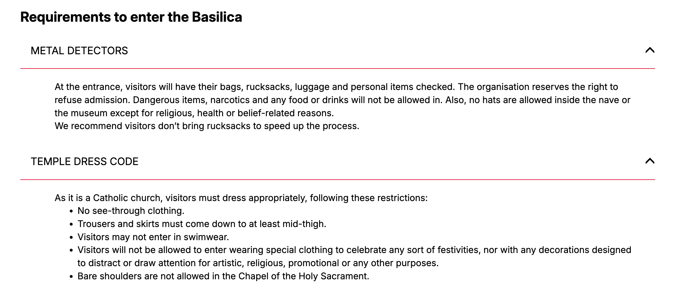 - 종교·건강·신념과 관련된 사유가 아닌 한, 성당 내부나 박물관에서는 모자 착용도 금지됩니다.